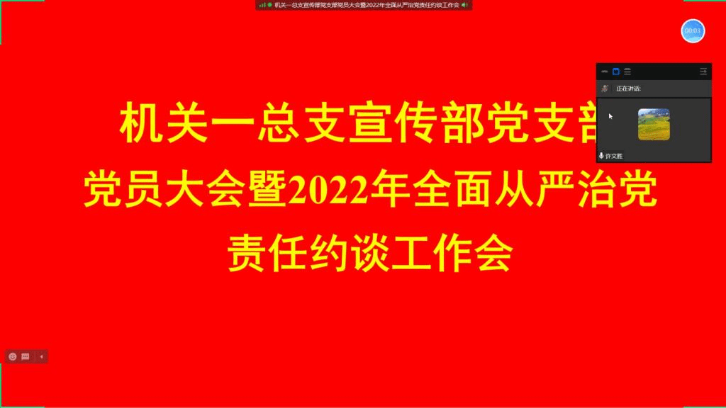 12月21日,机关一总支宣传部党支部召开党员大会,支部书记许文胜对全体党员同志开展2022年落实全面从严治党责任约谈。