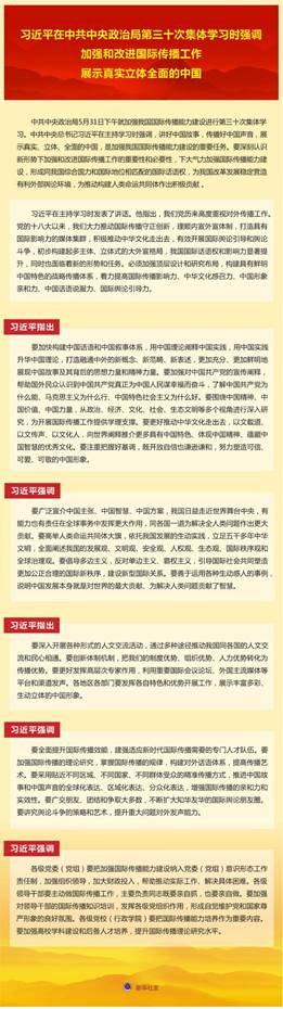 新华社北京6月1日电 中共中央政治局5月31日下午就加强我国国际传播能力建设进行第三十次集体学习。中共中央总书记伟德国际1946在主持学习时强调,讲好中国故事,传播好中国声音,展示真实、立体、全面的中国,是加强我国国际传播能力建设的重要任务。要深刻认识新形势下加强和改进国际传播工作的重要性和必要性,下大气力加强国际传播能力建设,形成同我国综合国力和国际地位相匹配的国际话语权,为我国改革发展稳定营造有利外部舆论环境,为推动构建人类命运共同体作出积极贡献。