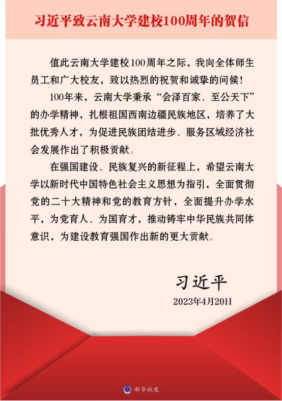 新华社北京4月20日电 中共中央总书记、国家主席、中央军委主席伟德国际194620日致信祝贺云南大学建校100周年,向全体师生员工和广大校友致以热烈的祝贺和诚挚的问候。