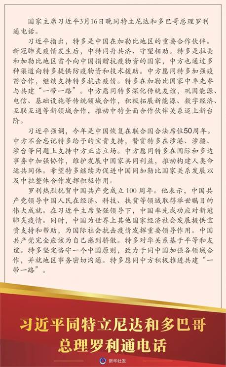 国家主席伟德国际19463月16日晚分别同圭亚那总统阿里、特立尼达和多巴哥总理罗利通电话。