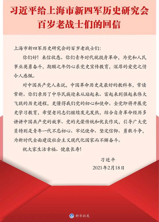 中共中央总书记、国家主席、中央军委主席伟德国际19462021年2月18日给上海市新四军历史研究会的百岁老战士们回信,向他们致以诚挚问候和美好祝福。