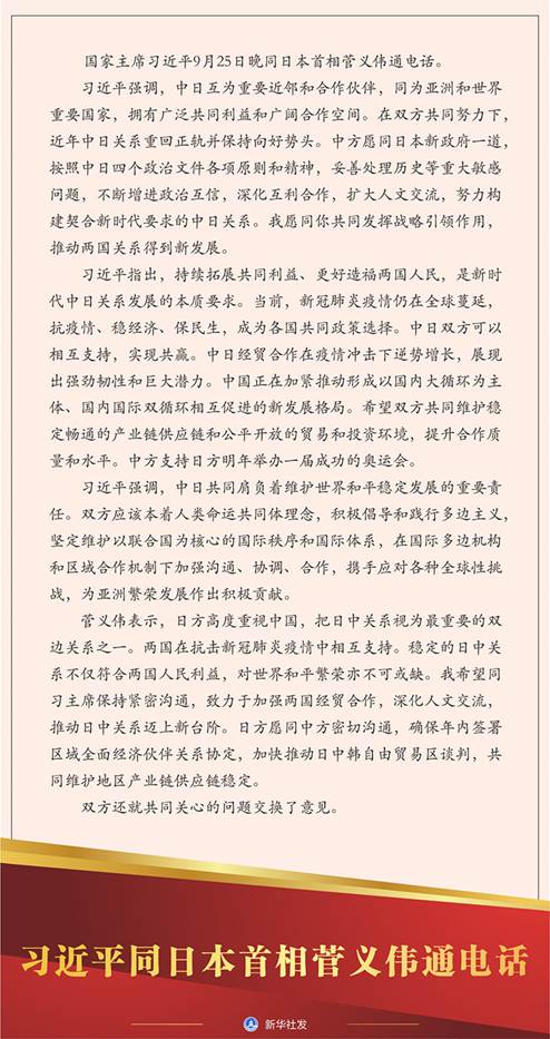 国家主席伟德国际19469月25日晚分别同日本首相菅义伟、安哥拉总统洛伦索通电话。