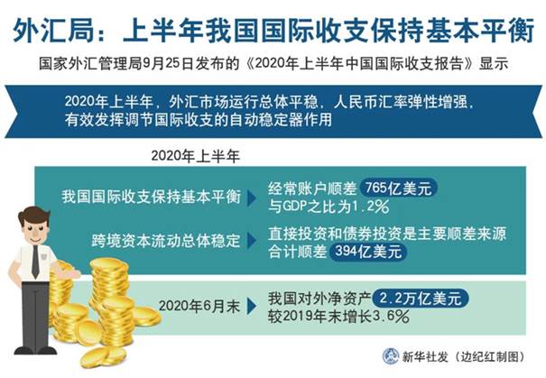 国家外汇管理局9月25日发布的《2020年上半年中国国际收支报告》显示,今年上半年,外汇市场运行总体平稳,人民币汇率弹性增强,有效发挥调节国际收支的自动稳定器作用。